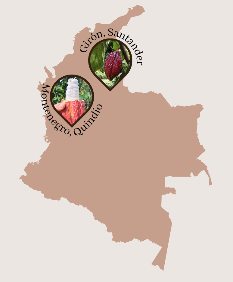 Nuestro chocolate proviene de un sólo territorio colombiano, lo que permite expresar el carácter único del cacao de origen y su identidad. Durante el año nuestro chocolate refinado puede ser de origen Montenegro, Quindío (lote actual) o puede ser de Girón, Santander.