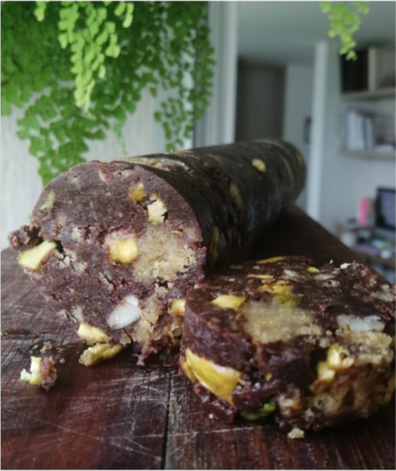 Entre los turrones de chocolate con nueces y los horneados con chocolate 100% cacao, tenemos en nuestro catálogo una receta especial, conocida como Salami de Chocolate con Pistacho. Es un postre espectacular, ideal para celebrar la pascua o para la temporada de navidad. Perfecto para compartir en familia y llevar como regalo a una reunión familiar.